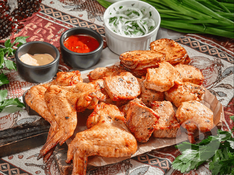 В состав набора входит: Шашлык из свинины 2 порции, Шашлык из курицы 1 порция, Крылья куриные 3 шт, Картофель запеченный 1 порция, Соус барбекю 30 гр, Соус сырный 30 гр, Соус томатный 90 гр, маринованный Лук 60 гр., Лаваш 3 шт.