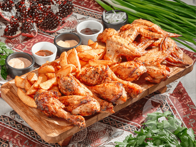 В состав набора входит: крылья куриные 6 шт, голень куриная 6 шт, картофель по-деревенски 3 порции, соус микс 30 гр, соус домашняя аджика 30 гр, соус барбекю 30 гр, соус сырный 30 гр, соус томатный 60 гр, лук.