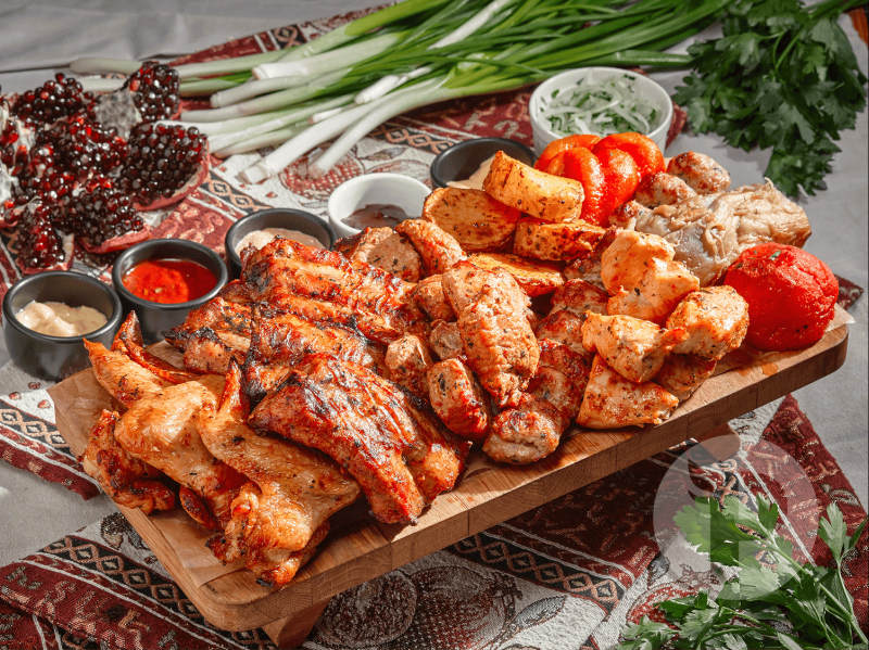 В состав набора входит: Шашлык из свинины 3 порции, Крылья куриные 1 порция, Ребрышки свиные 2 порции, Шашлык из курицы 1 порция, Люля-кебаб из курицы 1 порция, Запеченный перец 1 порция, Запеченный баклажан 1 порция, Запеченный помидор 1 порция, Запеченный картофель 1 порция, Соус барбекю 30 гр, Соус сырный 30 гр, Соус горчичный 30 гр, Соус микс 30 гр, Соус томатный 150 гр, маринованный Лук 100 гр, Лаваш 5 шт.