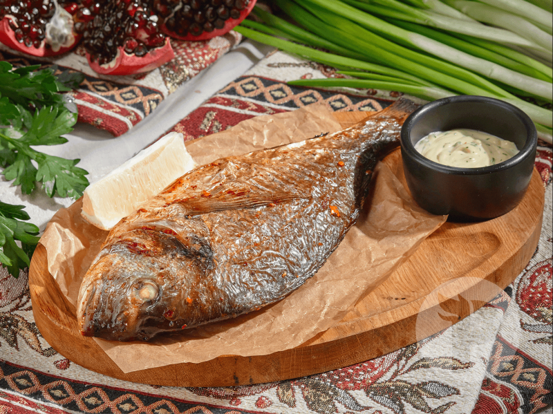В состав блюда входит: дорадо (250 гр), лимон (20 гр), чесночный соус (30 гр).