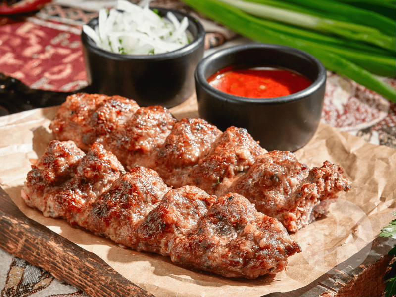 В состав блюда входит: люля-кебаб из говядины (180 гр). Подается с маринованным луком (20 гр) и томатным соусом (30 гр).