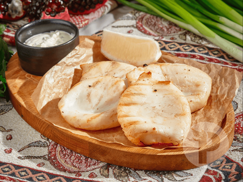В состав блюда входит: кальмар маринованный (150 гр), соус соевый (30 гр), лимон (20 гр).