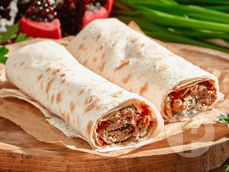 В состав блюда входит: люля-кебаб из баранины в лаваше. Подается с маринованным луком и томатным соусом, аджикой.