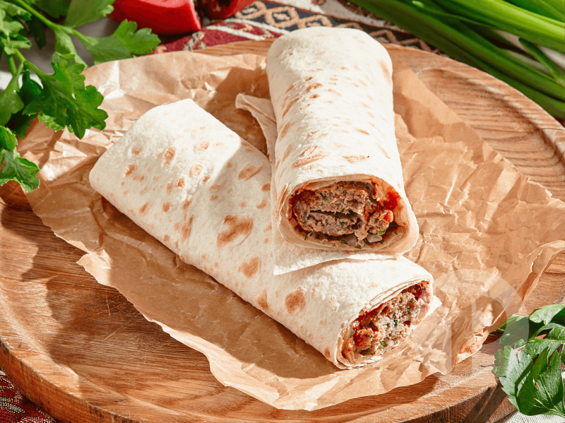 В состав блюда входит: люля-кебаб из курицы в лаваше. Подается с маринованным луком и томатным соусом и аджикой
