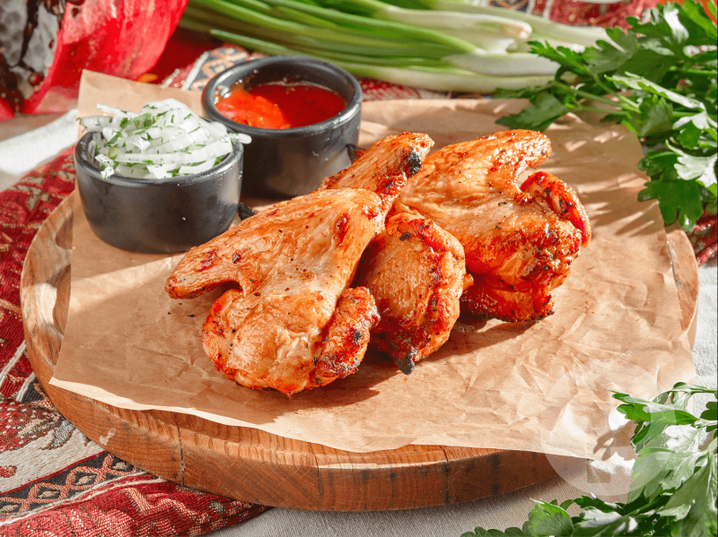 В состав блюда входит: крылья куриные 3 шт. Подается с маринованным луком (20 гр) и томатным соусом (30 гр).