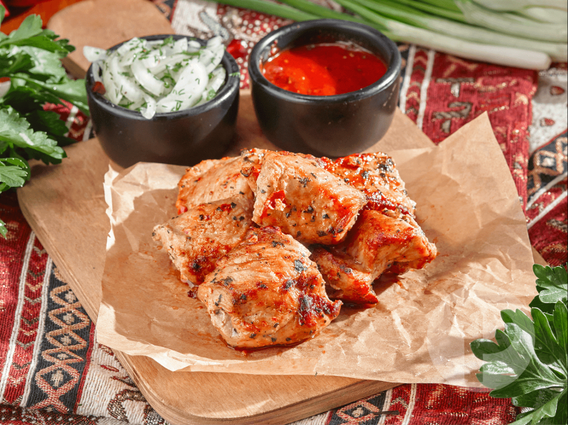 В состав блюда входит: шашлык из свиного окорока (200 гр). Подается с маринованным луком (20 гр) и томатным соусом (30 гр).
