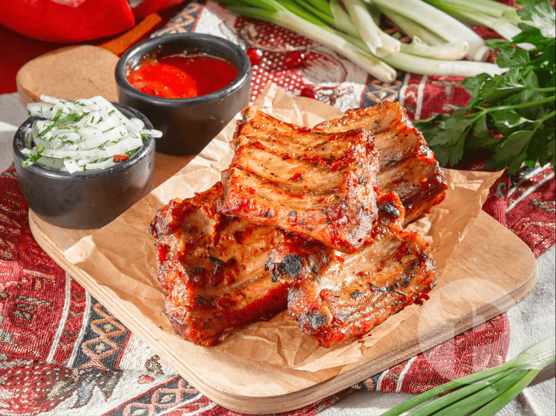 В состав блюда входит: ребрышки свиные (300 гр). Подается с маринованным луком (20 гр) и томатным соусом (30 гр)