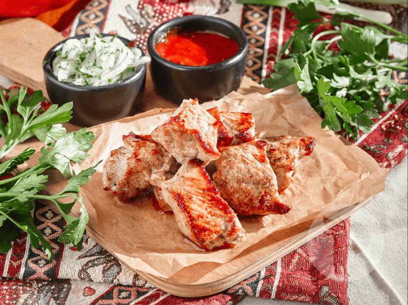 В состав блюда входит: шашлык говяжий толстый край (180 гр). Подается с маринованным луком (20 гр) и томатным соусом (30 гр).