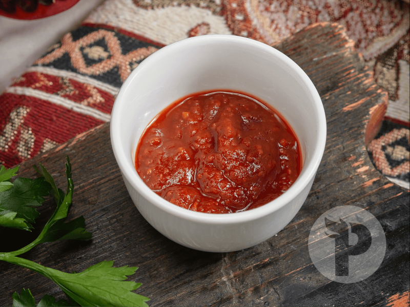 Состав: паста томатная, специи - томаты сушеные, чеснок, паприка, перец красный молотый, сахар, соль, масло растительное, уксусная кислота.