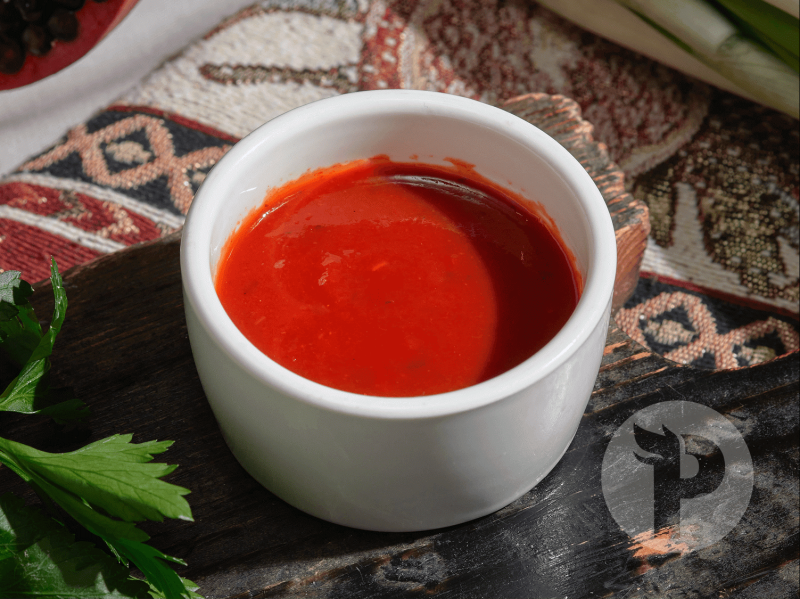 Состав: паста томатная, перец сладкий свежий, сок яблочный, соль, сахар, чеснок свежий, кинза, укроп.